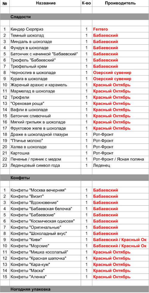 Темный шоколад (1 шт), Миндаль в шоколаде (1 шт), Фундук в шоколаде (1 шт), Батончик с начинкой "Бабаевский" (1 шт), Трюфель "Бабаевский" (1 шт), Трюфельный крем (1 шт), Конфеты "Москва вечерняя" (1 шт), Конфеты "Визит" (1 шт), Конфеты "Вдохновение" (1 шт), Конфеты "Бабаевская белочка" (1 шт), Конфеты "Бабаевские" (1 шт), Конфеты "Космическая одиссея" (1 шт), Конфеты "Оригинальные" (1 шт), Конфеты "Шоколадный вкус" (1 шт), Конфеты "Киви" (1 шт), Конфеты "Морские" (1 шт)